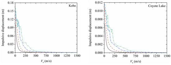 Additionally, the maximum hydrodynamic sloshing responses of the tank undergoing NF earthquake motion are larger than those undergoing FF earthquake motion in Figure 11, Figure 12, Figure 13 and Figure 14, which is attributed to the large amplitude in the range of the lower frequency for power spectral density of NF seismic records. The natural frequencies for the liquid sloshing of the soil–tank system are in proximity to the predominant low frequency of the NF earthquake records. The hydrodynamic responses of the tank are more sensitive to NF seismic action in comparison with FF seismic action. Consequently, attention should be paid to earthquake responses in proximity of active faults.