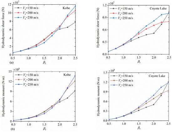 The maximum of the hydrodynamic response for the upper baffle height : (a) the shear force ; (b) the overturning moment .