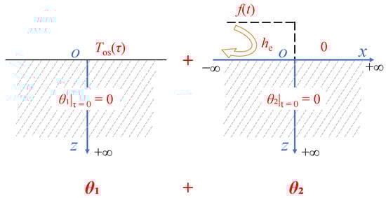 According to the superposition principle, as shown in Figure 2, the governing Equations (5)–(7) can be written as the sum of two equations. Suppose that T = θ1 + θ2, then