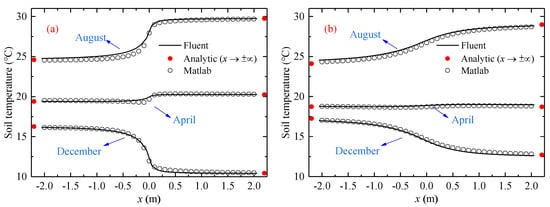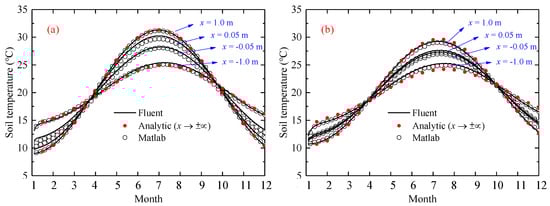 Figure 6 and Figure 7 described, respectively, the soil temperature distribution along the x dimension and the temperature variation over time. At x → +∞, the soil heat conduction could be thought of as one-dimensional in Equation (8). Its temperature distribution along the z-axis was calculated by Equation (12), which was marked with solid red circles in the figures. While, at x → −∞, the soil temperature also conformed to a one-dimensional heat transfer model. Carslaw and Jaeger analyzed it and obtained the solution in the integral form [37], which was calculated and marked with solid red circles as well.