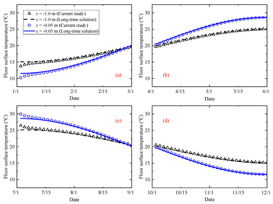 The long-time solutions of ground-couple heat transfer were developed mostly in previous studies, which ignored the initial temperature of the soil. In the current study, the initial conditions were also considered. The temperature at two positions of x = −0.05 m and x = −1.0 m were picked to represent the floor temperature distribution. Referring to Figure 6a, floor surface temperature had almost uniformly distributed in space, except for a small distance near walls (x = 0). Figure 8 shows the floor surface temperature in temporary housing built at different seasons. When buildings were built in the cold season, for example, on 1 January (Figure 8a), floor temperatures at the initial stage were lower than the long-time solution. In contrast, when buildings were built in the hot season, e.g., on 1 July (Figure 8c), the long-time solution underestimated the floor temperature at the initial stage. A visible temperature difference between the two solutions occurred if buildings were built in hot summer and cold winter. However, no obvious difference was found if temporary housing was built in transition seasons, seen in Figure 8b,d.
