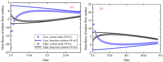Figure 9 compares the floor surface heat fluxes between the current calculation and the long-time solution. Set 1 January and 1 July as examples of the cold and hot climates, respectively. Heat fluxes transferred into the indoor environment were defined as positive. It showed that there were obvious differences in the face and edge heat fluxes. Edge heat fluxes along with the wall were overestimated by the long-time solution both in cold and hot conditions. Moreover, the face heat fluxes of the two methods are directed in opposite directions.