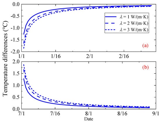 The higher the heat transfer capacity of the soil, the more heat or cold is stored in it. Figure 10 exhibited the floor surface temperature differences between the current study and the long-time solution at x = −1.0 m. Enough distance away from walls could lower the influence of the outdoor environment. It could be seen that temperature differences increased with the heat conductivity of the soil.