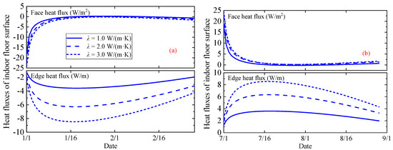 As shown in Figure 11, the face heat flux of the ground-couple floor was negative for temporary housing built in cold climates and was positive when built in hot climates. With the increase in soil heat conductivity, the absolute value of face heat flux increased. So did the edge heat flux.