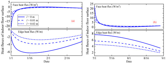 The expanded polystyrene (EPS) foam with heat conductivity of 0.042 W/(m·K) was assumed as floor insulation to study its effects on the floor surface heat flux. As shown in Figure 12, EPS insulation could obviously reduce both the face and the edge heat fluxes. The floor insulation could effectively decrease the heat transfer near walls, as 0.01 m and 0.02 m insulation could averagely reduce about 27% and 40% of the edge heat fluxes. As for face heat fluxes, the floor insulation resulted in a reduction at first and an increase then. The opposite direction of heat flux occurred in cold and hot climates. That is, the floor insulation just slowed down rather than prevented the cold or heat release of the ground.