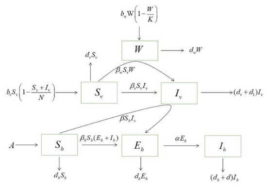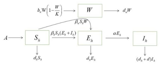 We consider a population of humans within a certain range, and there is an invasive population of a certain disease source, where represents the pathogenic population; this could be animals or humans. The pathogenic population is limited by the carrying capacity , which propagates with and exits the system with . For virus transmission in humans using the SEI model, the subscript denotes the human population; are susceptible, incubation, and infected population, respectively. The incubation population is not easy to distinguish, but it is infectious. Infected population means diagnosis, and no longer contact with a susceptible population.