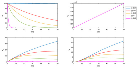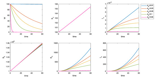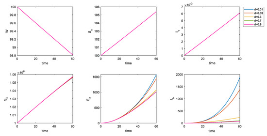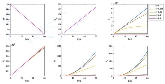 It is not difficult to see in Figure 9 that, by increasing , the number of susceptible populations do not change by much, but the number of incubation population and infected population significantly decreases. Via inanimate-mediated disinfection, you can actually control the spread of the disease in the population. When the disinfection rate was increased from 0 to 0.05, the numbers of the incubation and infected populations after 60 days were controlled. When the disinfection rate is increased to 0.5, the control effect is very clear.