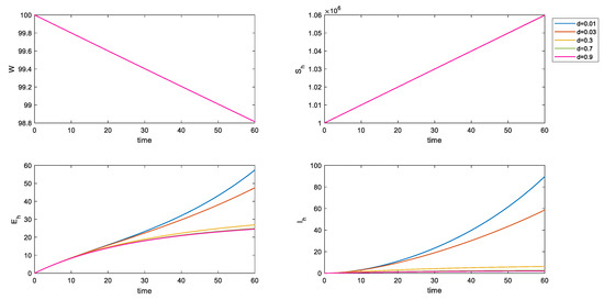 It is clearly observed in Figure 3 that, with the increase in , the increase in the removal rate of the pathogenic population, the number of incubation populations and infected populations are effectively controlled in the early stage of the infection, and isolation measures, which were adopted for this externally imported pathogenic population, are very effective.