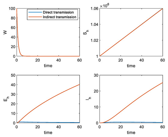 In the next section, we compare the numerical solutions of the two models, focusing on the transmission status of the disease at the beginning stage, and via a comparison, we investigate whether changes occur in the early stage of infection when SARS-CoV-2 has a new transmission route of person–object–person, and how to control such changes.