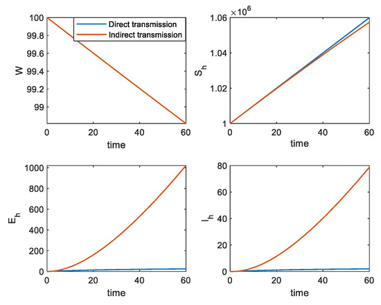 The influence of in the two models and the change trend in population are essentially the same. However, through a comparison of the three groups of different , it is not clear that, when is the same, regardless of whether it is a direct or indirect infection, there is essentially no difference in the level of pathogenic populations and susceptible populations. However, there is a significant difference between the number of incubation populations and infected populations. Indirect infection is more conducive to the spread of the disease. In the initial stage, even if , the number of incubation populations and infected populations can still reach about 40 and 20, respectively. When is smaller, the numbers of both populations are larger, and it is essentially impossible to control as a direct infection.
