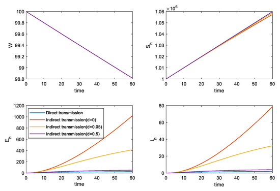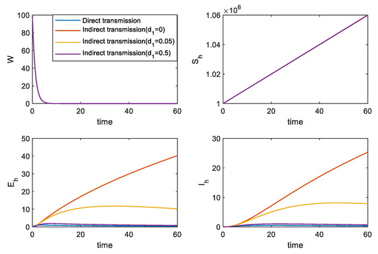 Regarding direct infection, the parameters and , can accurately control the spread of the virus by limiting the entry of pathogenic populations and effective isolation of infected population, and the spread of the virus can be effectively contained. In the process of indirect transmission, the same restrictions and effective isolation are not as effective as they should be.