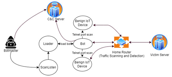 Recently, IoT networks have faced a number of security challenges due to the hardware limitations and processing capabilities of IoT devices and home edge routers. Simultaneously, in the last decade, the number of security attacks on the IoT network has increased at an unprecedented rate. Many of these attacks enslave IoT devices in a home environment and use them as bots for attacking a victim server. For example, a well-known botnet called Mirai was launched in October 2016; infected IoT devices bombarded a victim DNS server with 1.2 Tbps of data [8,9]. Similarly, another IoT botnet called BashLite was used to launch a DDoS attack against the victim servers [10,11]. The BashLite botnet searched for possible credentials among 6 generic usernames and 14 generic passwords. The conceptual idea of these botnets is to brute force all the possible combinations and try them until they get access to the IoT device. Once a successful connection is established, the botmaster installs the malicious code in the botnet and later uses them in a DDoS attack on the victim server. Since IoT devices are weakly configured and even sometimes available for connection without proper authentication, the attacker finds it easy to load the malicious code onto them.