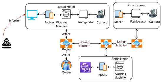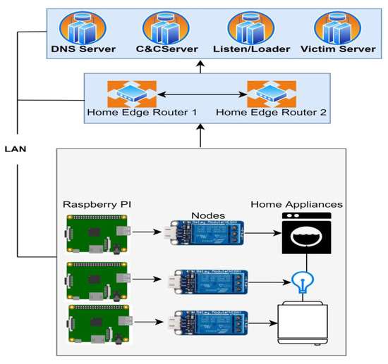 As the C&C server is available on the same LAN, we download the malicious code to one of the IoT devices to infect it. This is simply done by running malicious code on any of the IoT devices. Once the IoT device is infected with malicious code, it is then connected to the home router via the gateway. In order to design a common gateway to format the traffic to be understandable over the internet, we used a switch and configured it as a gateway. This switch is further attached to the home router. Each home appliance is attached to a Raspberry Pi 4.0 module with 4 GB of RAM and a Quad-core 64-bit processor. Similarly, the specifications of the home router used for the experiment are: dual Gigabit Ethernet ports, dual USB 3.0 ports, Raspberry Pi Compute Module 4, 4 GB RAM, 32 GB eMMC, and a Quad-core 64-bit processor.