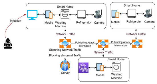 A number of solutions are used in the current literature for detecting abnormal traffic generated by IoT devices [12,13,14,15]. These methods are mainly based on the idea of using machine and deep learning techniques to check the network traffic on the home edge router and classify them as normal and abnormal. However, such solutions require high memory and processing requirements, which are not available in most cases. In addition, fulfilling these requirements and implementing the solutions on the home edge router may lead to delaying the processing of urgent and necessary tasks. For example, in [16], a study covers a two-fold machine learning system to detect IoT botnet attacks. Once the IoT devices get compromised and start DDoS attacks, the machine learning system generates 33 types of deep learning models using ReSNet-18 to scan 60 DDoS attacks from publicly available datasets. The authors also discussed the lifecycle of the botnet, which they divided into five stages: first, scanning, second, malware injection, third, botnet connection, fourth, command execution, and, lastly, maintenance and up-gradation. Similar research in [17] proposed a hybrid approach to detect IoT botnet attacks using supervised and unsupervised machine learning techniques using a publicly available BaIoT dataset [18]. N-BaIoT stands for Network-Based Anomaly Internet of Things, which uses deep learning techniques to perform anomaly detection. The authors examined two botnets, Mirai and BashLite, to collect traffic data before and after the infections of the IoT devices. The authors evaluated transfer learning techniques by assessing the accuracy of models trained on specific devices when they are applied to identical devices [18]. Nguyen et al. [19] created a novel graph-based approach to detect IoT botnets in a lightweight method using PSI-graph that discovers botnet lifecycle with deep learning. They trained different IoT botnet datasets using Mirai, BashLite, Benign, and other botnets with a total of 10,000 samples. The authors clarify the botnet lifecycle and how IoT devices are infected with a botnet. They also explained the working of a bot when it logs into a device: the bot infects a loader, which is used to download and execute the corresponding binary version of the botnet, typically via FTP and HTTP [19]. Recently, researchers studied different IoT systems’ major attacks within the network and physical layer [20]. Similarly, they compared with normal botnets, IoT botnets such as Mirai, and other existing tools to detect botnets. Further, they divided IoT botnet detection into two parts: Host-Based and Network-Based Detection Techniques. In [20], the authors created a sandbox called V-sandbox to use for IoT botnet dynamic analysis with more than 9000 IoT botnet samples. These samples were divided into 6000 IoT bots and 2900 IoT benign samples [21]. Similarly, HKK Idriss et al., in [22], discussed the Mirai botnet and how a DDoS attack detection could be performed using malware hash detection and behavior-based detection. The authors performed the scanning in an IoT networking environment using shodan.io [23] and other vulnerable search engines. In a similar research work in [24], the authors analyzed Mirai botnet traffic using Wireshark and pyshark. Further, they simulated botnet attacks using six local testbeds.