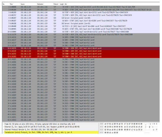 The traffic passing through the home router is captured with Wireshark at different times. Figure 5 shows the main open dataset representation, which was captured after the infected IoT devices launched a DDoS attack on the victim server. As depicted in Figure 5, the infected IoT devices send a huge amount of SYN packets to the victim server without waiting for the acknowledgment message from the server. This slows down the working of the victim sever in providing services to legitimate IoT devices. In order to check that the victim server failed to fulfill the services of the benign IoT devices, a benign IoT device is selected to send a request to the victim server to obtain the required services. However, as the victim server is busy responding to the infected devices, the benign IoT device will never get a chance to receive the services from the victim server. Finally, the victim server will reset and stop listening to new requests once its cache is clear and ready to receive new messages. In the case of the IoT scenario, the data generated from each device have high preferences. For example, if a camera detects an abnormal behavior of the main gate and tries to send this urgent data to the homeowner. However, the router is busy providing the services to the infected device, which may cause a delay in sending the information to the homeowner on time. Finally, it may result in something unwanted occurring, or damage to the house.