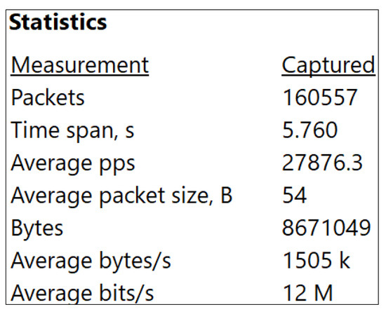 The statistics of the packets generated during the attack are shown in Figure 6. This statistic helps us in screening the packets in the future. In addition, a profile for each IoT device could be built by saving the statistics of each IoT device traffic in the log. For example, based on the packet statistics of each IoT device, we can build an appropriate and suitable traffic generation profile. The traffic generation profile can help in reducing the limitation of the system in terms of blocking normal traffic. For example, we can set a high packet generation threshold for a camera during a specific time of the day. The packet size of streaming data is always greater than that of normal packets and thus we can set the camera to transmit information in a specific period. For example, if a camera is scheduled to send the packet during a specific time, then the router rules could be changed to avoid scanning packets based on the pre-defined threshold of 50 packets. In the case of a camera, the threshold could be increased to 100, etc. Similarly, a refrigerator is continuously creating data, thus such a profile could be built for a refrigerator so that the router does not block the traffic from the refrigerator if the packet transmission exceeded 50 packets.