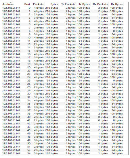 Finally, we show the TCP port status of the source node sending packets to the destination (Figure 8). As we can see in Figure 8, the traffic from the source IP address i.e., malicious IoT devices, is slowly increasing over time.