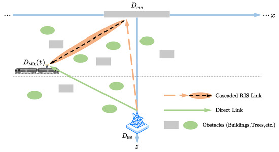 We assume a downlink single-input single-output RIS-assisted HSC system, as shown in Figure 1. There are one roadside BS, one train-side moving mobile relay (MR) with speed v, and one RIS with M elements near the BS. Both the BS and the RIS are surrounded by certain obstacles, such as buildings and trees [20,21]. The single antennas of the transceiver and the M elements of the RIS are all isotropic. The origin point of the Cartesian coordinate system is . The positions of the BS, the MR, and the -th element of the RIS are denoted as , and , respectively. Besides, we assume the channel state information can be obtained in advance using the predictive information [10,11].