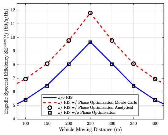Figure 3 shows that the maximized ergodic SE of the proposed RIS-aided HSC system in (29) increases from 5.41 bit/s/Hz to 11.79 bit/s/Hz, when the vehicle moving distances are 100 m and 250 m, respectively. This is because and are the smallest when the moving distance of the vehicle is 250 m. Then, the SE decreases to 5.41 bit/s/Hz again at 400 m moving distance, which is as expected since the channel gains and and Rician factors are all distance-dependent. Therefore, the ergodic SE and the transmission distances (i.e., , and ) are inversely proportional. Besides, for ease of comparison, we also provide the case without phase optimization, i.e., where is the uniform distribution. It is shown that before optimization, the ergodic SE of the proposed system is almost the same as the scenario without the RIS. This is because the power of the received signal increases only proportional to M, as (33) shows. Thus, obtaining the optimal phase shift in (23) is crucial for the proposed system. Moreover, note that the analytical and simulated results of the ergodic SE match well, which validates Proposition 1. Therefore, we use the analytical upper bound SE expression in (29) in the rest of this section.