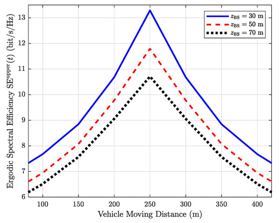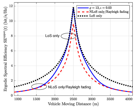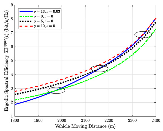 Figure 5 shows the ergodic SE of the cases with different environmental factors and . It can be observed that the ergodic SE of the cases with , [20] and , are only the same when the vehicle moving distance is 1975 m. Other two of the same points appear in 2175 m and 2350 m, if , and , [19]. This result reveals that there is a clear difference between distance-dependent and fixed Rician factors. Therefore, the simulation results in Ref. [19] could be improved since it only considered the fixed Rician factors.