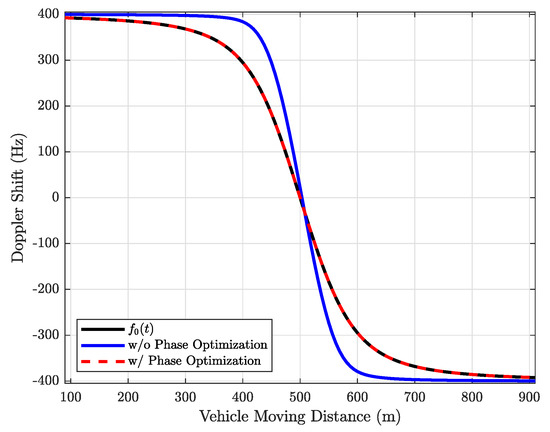 It can be observed that if the optimal phase shift in (23) is adopted, then is equal to . In other words, although optimizing the phase shift of the RIS cannot remove the DS entirely, it can align them to . Accordingly, the carrier frequency of the received signal in (22) changes from to . Note that can be ignored if .