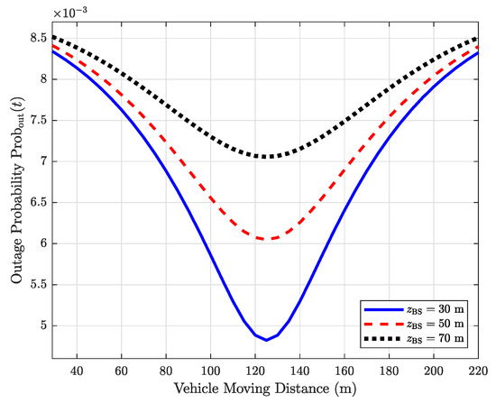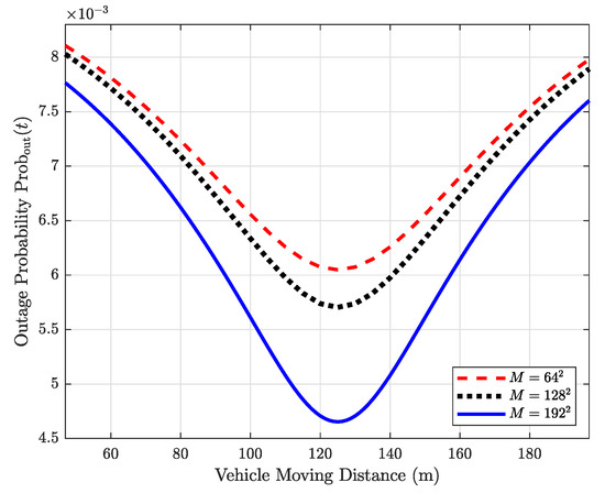 From Figure 8, it can be seen that when the vehicle approaches the BS and the RIS, the outage probability reduces. Besides, increasing the element number of the RIS can decrease the outage probability. In particular, when , , and , the lowest outage probabilities are , and , respectively. This result validates Propositions 2 and 3. Besides, increasing the number of elements could decrease the outage probability, as expected, but more elements may bring a higher computational complexity if there is no prior channel state information. Therefore, a tradeoff between enhancing system performance and reducing computational complexity is necessary when designing a practical RIS-assisted HSC system.
