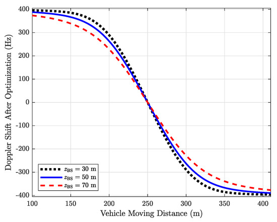 In Figure 7, we plot and the with the maximal absolute value as the example. It can be seen see that after optimization (i.e., using in (23)), the DS at time t, , can be aligned to , which means that the Doppler spread is reduced to zero. Specifically, when the moving distance is 400 m, without optimization is 380 Hz, but with optimization is reduced to 295 Hz, the same as . Similarly, when the moving distance is 700 m, without optimization is 400 Hz, and with optimization is just 365 Hz. This result validates Remark 3. Besides, it can be observed that when the vehicle is far enough from the BS and the RIS, i.e., the moving distance is smaller (larger) than 100 m (900 m), the and are nearly the same and stationary. This is because at this time. Besides, it is noteworthy that the positive and negative signs of the DS only reflect its deviation from the carrier frequency . In other words, the positive and negative DS has the same influence on the system.