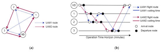 - Binary variable that is equal to one if vehicle travels from to and zero otherwise. - Departure time of vehicle from vertiport , where - Arrival time of vehicle at vertiport , where - Waiting time of vehicle at depot , where - Speed of vehicle , where - Parameters;