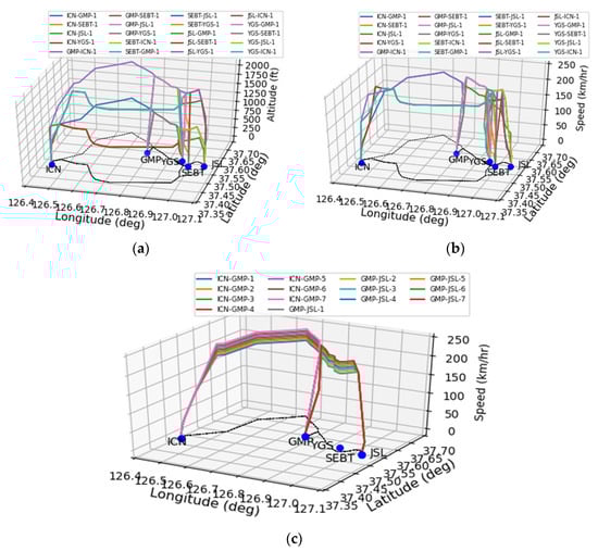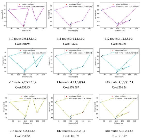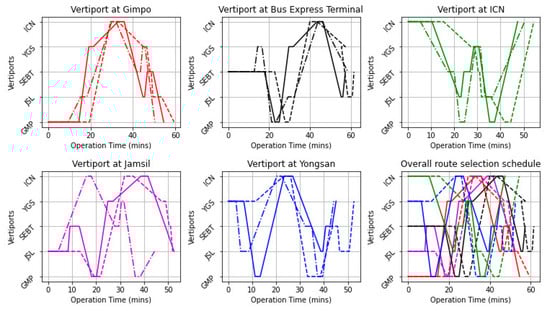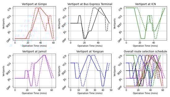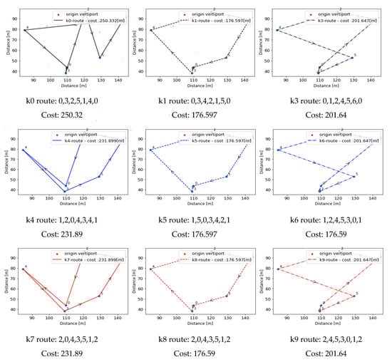Appendix A.3. Case Study 2: Optimum Route for Each Vehicle at Each Vertiport and Selected Corridors