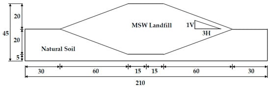 For the slope stability analyses in landfills, a model with a width of 210 m and a height of 45 m was created (