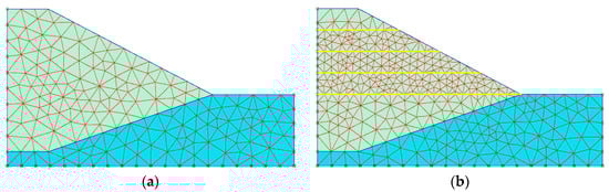 In the analyses, the standard boundary conditions available in the PLAXIS program were selected. Vertical and horizontal displacements at the base of the geometric model (ux = 0, uy = 0) were assumed to be zero, while on the vertical side of the slope, only vertical displacements were taken into account (ux = 0, uy = free).