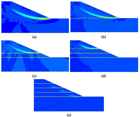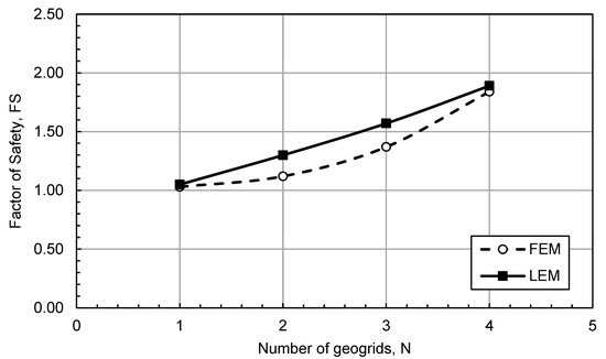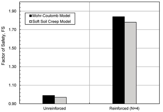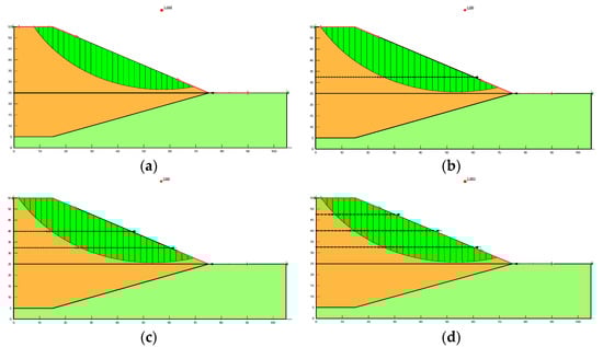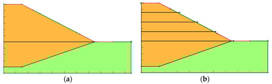 In the unreinforced case, the analyses were carried out using two phases. In the first phase, the initial stresses due to the soil self-weight were created, and in the second stage, the phi-c reduction analysis was performed. In the reinforced case, the geogrid reinforcement was activated, and the analyses were carried out. For the finite element analysis, the slope geometries considered in the reinforced and unreinforced conditions are shown in