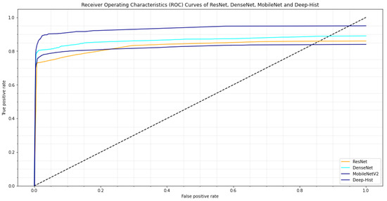 Figure 4 also shows that a recall of 0.5 percent denotes that the classification algorithm has a large number of false negatives, which can be caused by imbalanced classes or untuned model hyperparameters, whereas a recall of 1.0 percent demonstrates that the classifier has confidently predicted for the extracted features. Furthermore, when the Area Under the Curve (AUC) is 1 or close to 1, the classification algorithm has successfully discriminated all positive and negative class points, but when AUC is zero, the classification algorithm classified all negatives as positives and vice versa. The True Positive Rate (TPR) is shown against the False Positive Rate (FPR) at varying levels of intensity on the Receiver Operating Characteristics (ROC) Curve. Figure 4 illustrates how classifiers with curves closer to the upper left corner perform better. In addition, when the classifier curve approaches the ROC space’s 45 diagonal, the test becomes less accurate. A probability in the range [0.0, 0.49] implies a negative result (0), whereas a probability in the range [0.5, 1.0] suggests a positive event (1). The Deep-Hist accuracy is 0.95, ResNet = 0.87, MobileNetV2 = 0.84, and DenseNet = 0.88 are closer to the top left corner in the experimental findings.