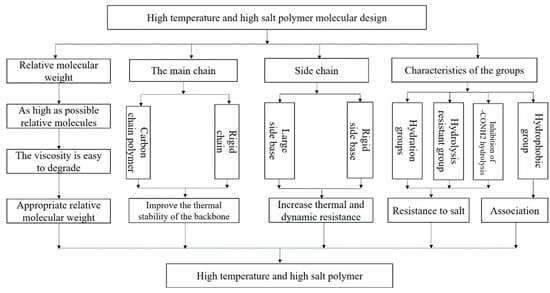 - Figure 1 shows the design idea for the new polymer. Polyacrylamide is severely hydrolyzed in high-temperature and salinity reservoirs, and the more severe the hydrolysis, the easier it is for precipitation to occur from the solution. Furthermore, the solution viscosity retention is low. In order to obtain the desired temperature and salt resistance performance in the polyacrylamide, the polymer was designed according to the molecular design principle [39].