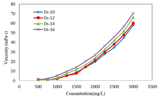 As shown in Figure 6, the DS-n hydrophobic monomers are the same hydrophobic monomer but have different chain lengths. According to the experimental data, the viscosity of the polymer increased with the lengthening of the hydrophobic carbon chain. The viscosity of DS-16 was the highest, so DS-16 was chosen as the hydrophobic monomer for the target polymer.