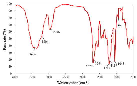 In order to verify whether the polymeric monomer participated in the copolymerization, the infrared spectrum of the sample was analyzed with infrared spectroscopy. The infrared spectrum of the sample is shown in Figure 8. There were characteristic absorption peaks of sulfonate at 1217, 1187 and 1043 cm−1, which proved the existence of AMPS; a characteristic absorption peak of pyrrolidone (-CON) at 1670 cm−1, which proved the existence of NVP; and a characteristic absorption peak of amide (-NH2) at 3406 cm−1, which proved the existence of AM. There was a weak characteristic absorption peak of (-COO−) at 1644 cm−1 and an absorption peak of quaternary ammonium at 963 cm−1, which proved the existence of hydrophobic monomer DS-16. From the above absorption peaks, it can be concluded that the polymer was a copolymer of AM/AMPS/NVP/DS-16.
