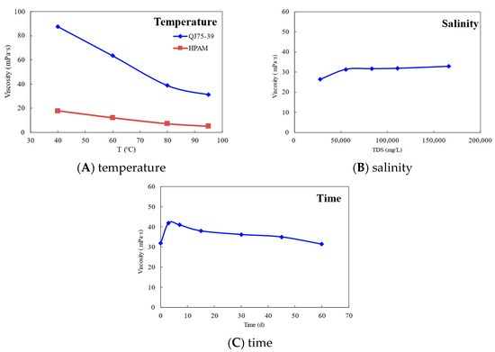 Figure 9A shows the viscosity curve of the polymer 2000 mg/L solution at 40~95 °C. As shown in Figure 9A, the viscosity of the polymer solution decreased with the increase in the temperature. The synthesized polymer QJ75-39 had better temperature resistance than the conventional polymer HPAM. When the temperature reached 95 °C, the viscosity of the synthesized polymer QJ75-39 was 31.3 mPa·s, while that of the conventional polymer HPAM was 5.1 mPa·s. The viscosity of QJ75-39 was much higher than HPAM at 95 °C. This was mainly due to the fact that the movement of the HPAM molecular chain accelerated with the increase in the temperature, and the spatial network structure of HPAM was destroyed to some extent. The higher the temperature was, the lower the viscosity. The synthesized polymer had better temperature resistance than conventional polymers. When the temperature reached 95 °C, the viscosity of the synthesized polymers was 31.3 mPa·s, which was mainly a result of the introduction of DS-16 hydrophobic monomers and AMPS monomers. DS-16 and AMPS have strong hydrophilic groups, so they can effectively inhibit the viscosity loss caused by the hydrogen bond breakage of amide and carboxyl groups.