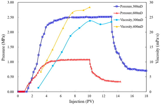Table 6 lists the results of the polymer injection capability experiments. Figure 10 shows the variation in pressure and effluent viscosity with injection volume from the polymer injection capacity experiment. The 2000 mg/L polymer solution was injected into 300 mD and 600 mD cored, respectively. The experimental results show that the polymer could be stably injected into cores with porous media of 300~600 mD. The injection pressure remained stable after a rapid rise. The injection pressures of cores A and B were 2.5 MPa and 1.08 MPa, respectively. After rising rapidly, the viscosities of the effluents were stable at 23.7 mPa·s and 28.2 mPa·s; the viscosity retention rates were 75.7% and 90.1%. The polymer had high viscosity retention. This indicates that the polymer solution could be effectively conducted to the deeper part of the reservoir and establish certain RFs and RRFs. As shown in Table 5, the RF and RRF of core A were higher than those for core B. This indicates that the polymer solution was more likely to be retained in the low-permeability core. When the polymer was adsorbed in core pores, the effective pore volume decreased, the permeability decreased, and the RF and RRF increased. The RF and RRF could still be kept at high values (the values were 353.4 and 98.9 and 259.5 and 81.7). This shows that QJ75-39 had strong abilities to improve the fluidity ratio and to absorb and replenish under the conditions of high temperature and high salinity.