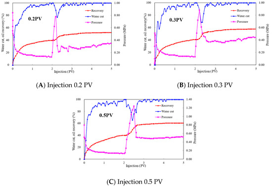 Table 7 shows the results of the oil displacement experiments. As shown in Figure 11, at the beginning, the injection pressure dropped rapidly and, when the oil displacement begun, the injection pressure slightly increased until it became steady. After the recovery was gradually increased to a certain value, it started to increase more slowly and, finally, remained unchanged. This was mainly because the water flooding involved a smooth migration of the oil in the formation, and the recovery levels in the water flooding stage reached 39.5%, 40.55% and 39.7%, respectively. Following the injection of the polymer, it can be seen that, when the amounts of the polymer injection were 0.2 PV, 0.3 PV and 0.5 PV, the ultimate oil recovery reached 52.26%, 57.72% and 60.35%; the lowest water cut reached 77.14%, 68.75% and 65.52%; and the EOR values were 12.76%, 17.17% and 20.65%. The pressure difference increased, and it can be seen that the polymer QJ75-39 could block the high-permeability pores and increase the sweep volume. The polymer oil recovery was higher than the water flooding, and this was due to both the improvement in the washing efficiency and the increase in the volume of the sweep.