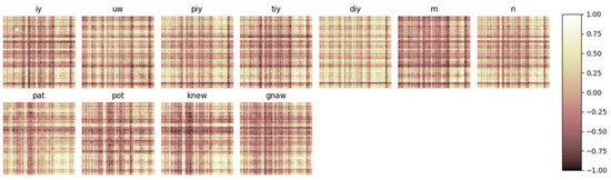 In Table 4, we computed the Euclidean distance between the mean of each phoneme and word analyzed for the cross-covariance in the frequency domain. We observed that these distances are smaller than the ones computed for the extracted features obtained after the first CNNLSTM layer (Table 5), meaning that, after the signal was processed by the first neural network layer, the feature space of the utterances was modified, and the features became more separable.