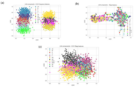 Further, we investigated the features by computing the linear discriminant analysis (LDA) to reduce the features’ dimensionality to only two components for visual inspection of the computed features. Figure 2 presents a comparison between the results obtained by applying LDA to the computed features cross-covariance in frequency domain (a), the raw signal in time (b), and computed features cross-covariance in time domain (c). It can be easily seen that, when using the frequency domain cross-covariance, the features are very well-structured into separate clusters, compared to the results obtained using the time domain signal or the time domain cross-covariance as features, cases where the classes overlap and the vectors are mixed in the same region of feature space. Another observation regarding the LDA results is the separability of the phonemes versus words. It can be seen that words and phonemes occupy different regions of the feature space.