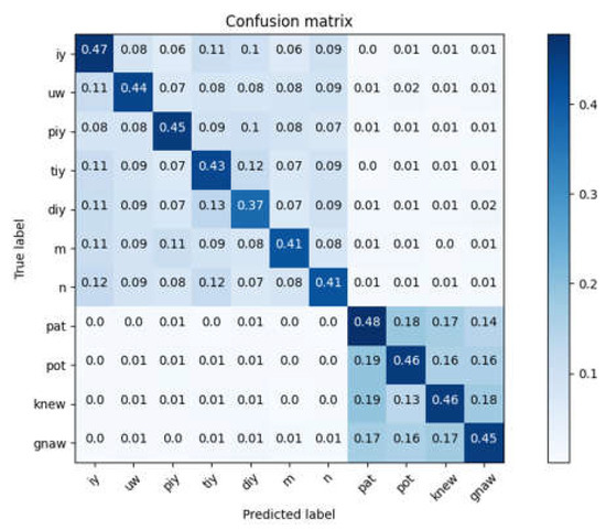 The mean confusion matrix of the k-folds is presented in Figure 5 and reveals that there is hardly any confusion between the phonemes and words, as expected after the visualization of the LDA dimension reduction results in Figure 2.