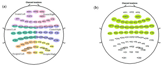 The representation of the different brain areas selected for the channels dimension reduction corresponding to the (a) major areas of the EEG represented with different colors and (b) ASBA.