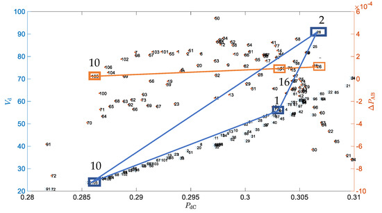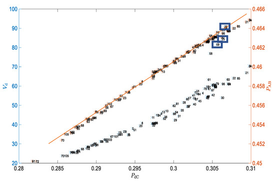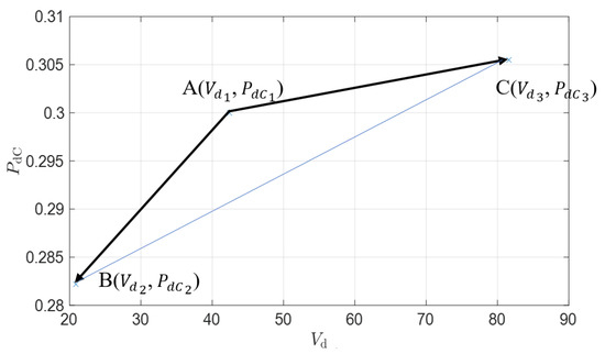 In Figure 1, the vector coordinate is (Vd2 − Vd1, PdC2 − PdC1) and the vector coordinate is (Vd3 − Vd1, PdC3 − PdC1). The absolute value formula of the cross product with the and vectors is shown in Equation (23).