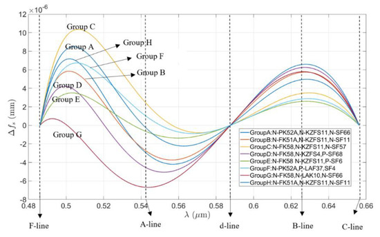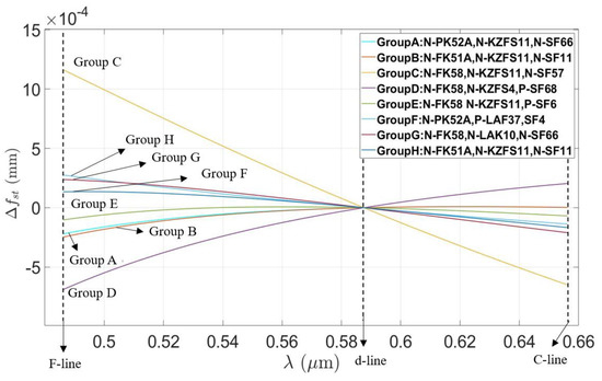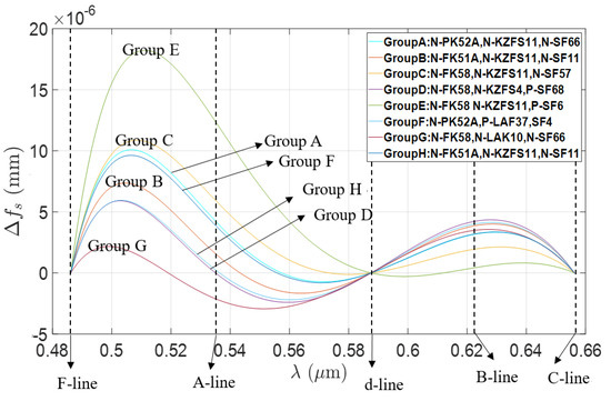 The illustration method was used to select eight triplet lens combinations. Figure 5 shows the chromatic aberration curve, in which the vertical axis shows the focal length shift ΔfS and the horizontal axis shows the wavelength.