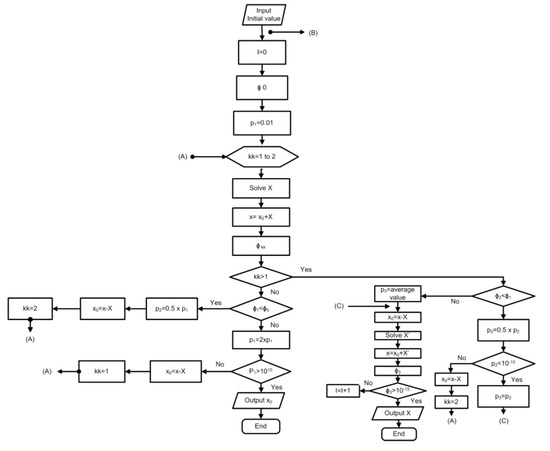 where AT is the transposed matrix of A; I is a unit matrix, p is a damping factor; and f0 is the matrix containing the elements f10, f20, …, fm0. If x and x0 are the matrices containing the elements x1, x2, …., xn, and x10, x20, …., xn0, respectively, we can obtain