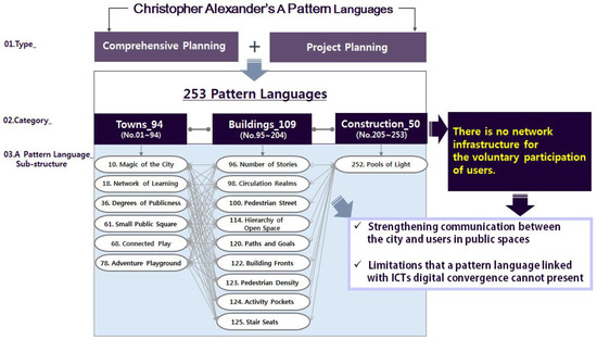 The pattern language does not contain the physical and contextual network infrastructure elements that create voluntary participation in the urban planning of the public space as analog urban planning, which is traditional urban planning. In other words, there are physical planning hardware guidelines but no infrastructure software elements in which users can participate. First, the interrelationship between public space and users was examined as a place-oriented strategy of openness, participation, sharing, and cooperation for 253 pattern languages based on existing urban planning standards [2]. As a result, the physical factor for public play space suggested by Christopher Alexander was a street network centered on private buildings and architectural spaces (Figure 1). This was the application of pattern language for activating the street environment with a fixed architectural infrastructure and facilities, excluding physical factors in which users voluntarily participate. Therefore, it is insufficient to reflect the user’s requirements according to the spatial characteristics of a pattern language [3]. This phenomenon is a contextual evolution in which 253 pattern languages did not form the basis for user experience and observation through the comprehensive or business plan of urban planning [4]. In addition, 16 out of 253 pattern languages were derived from examining the interconnection of cooperation and joint participation in using the 253 pattern languages, according to the region’s characteristics, to strengthen communication between the city and the users in public spaces (Figure 1).