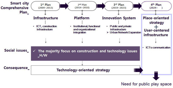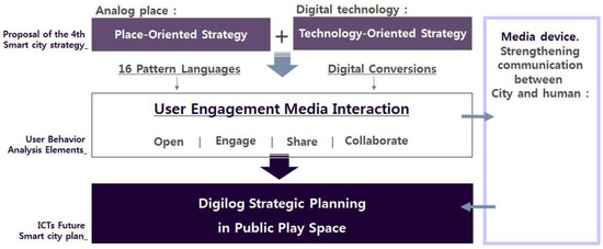 In this respect, the limitations of the 3rd smart city plan should be considered in the ICTs’ Future 4th smart city plan, a model to strengthen communication between cities and humans using 16 pattern languages derived from existing public spaces (Figure 2 and Figure 3). This is a model plan in which user participation is the subject, and digital convergence media-interaction is strengthened. As a method for verifying this, a public play space based on user behavior analysis was established, with user participation-type digital technology and place-oriented open participation, sharing, and cooperation software keywords in 16 hardware pattern languages (Figure 3). In particular, existing public space and ICTs’ Future 4th Plan in the smart city at the public play space, digilog strategic planning, should be research models that include digital technology and human touch, which are communication tools to strengthen user participation (Figure 3).