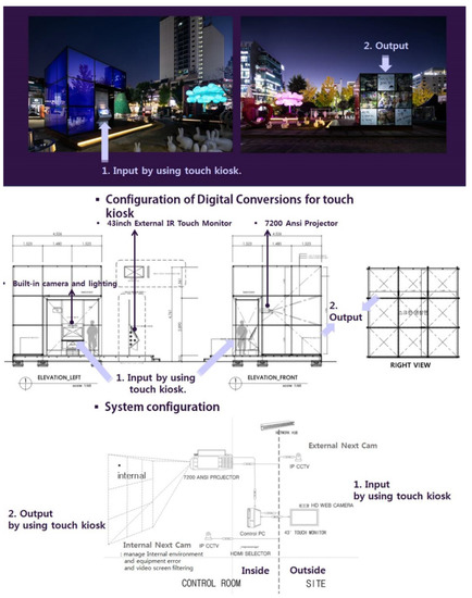 This large screen embodies the cultural method of young people who communicate through novel networks and screens using media interaction technology (Table 3 and Table 5, Figure 5 and Figure 6). (1) and (2) through the kiosk, users can take a picture or send it by handwriting directly on the screen. The operation method is the same system as the concept of a smartphone’s touch application (Figure 7: 1. Input by using touch kiosk). This system concept is a media communication tool, and the kiosk induces natural user recognition. The easily recognized UI scheme is designed so anyone can efficiently operate it. Most media interaction technologies do not transmit information through projection mapping and multi-display (LED) synchronization, but have adopted a method of transmitting content in conjunction with a beam projector. (Table 5, Figure 6 and Figure 7: 2. Output by using touch kiosk).