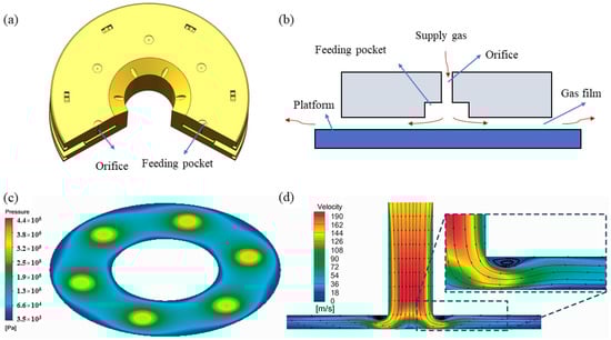 In aerostatic thrust bearings (ATBs), high-pressure gas is introduced between the moving surface and the static surface. A high-pressure gas film with a certain bearing capacity and stiffness is formed between the friction pairs. Thus, aerostatic bearings have the following advantages, such as low friction, high speed, high precision, and long service life [1]. A schematic photograph of aerostatic thrust bearings (ATBs) is depicted in Figure 1a. The pressurized gas is fed from an external source. It enters the bearing gap through the restrictor and finally flows to the atmosphere at the outer boundary of the bearing, as shown in Figure 1b. The pressure redistribution and throttling effect of gas are achieved in this process. The pressure distribution in the gas film of the ATB is shown in Figure 1c. The pressure near the orifice is higher, and the gas pressure gradually decreases when it is far away from the orifice. The velocity contour near the orifice is shown in Figure 1d [1]. Along the radial direction, the velocity decreases gradually.